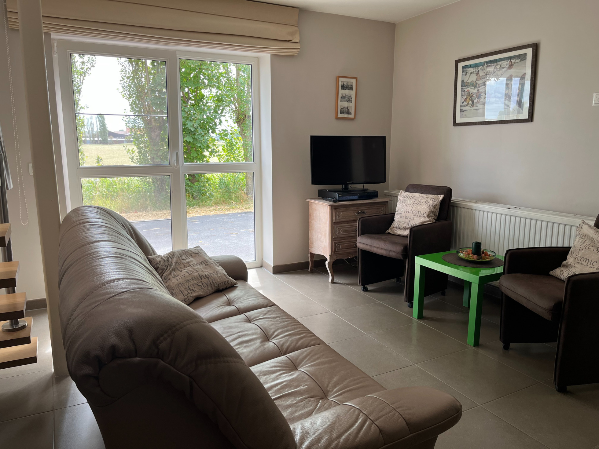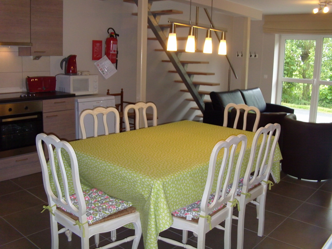 Eettafel met 6 stoelen, gezellige zithoek met televisie en dvd