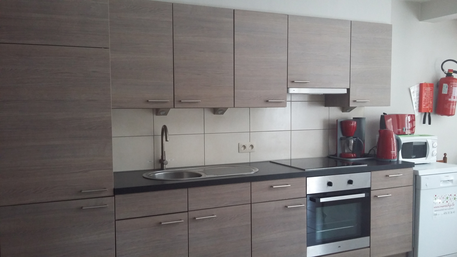 Volledig ingerichte keuken, keramische platen, oven, koelkast met vriesvak, koffiezet, vaatwas en microgolf.
